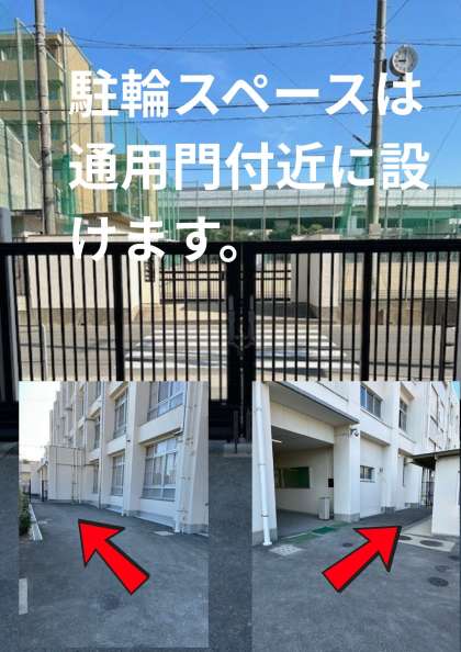 ライフさんや北之町公園などへの駐輪はご遠慮ください。生徒通用門付近に駐輪スペースを設けさせていただきます
