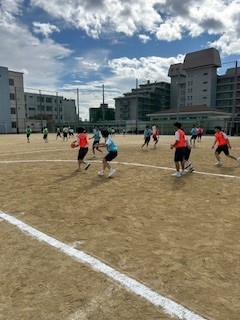 ゲームを行うために基本スキルを習得することを目的とした練習行っており、パス回しを中心に練習し、班で【良かったこと】【課題】を話し合い発表していました。