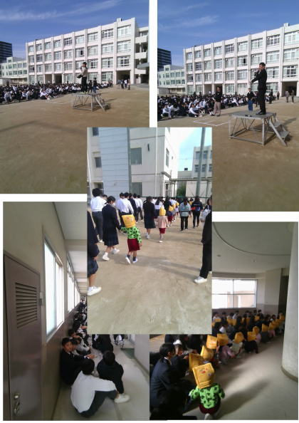 本日は中学生だけでなく、【野里幼稚園】の園児や先生方も訓練に参加していただき、訓練が終了しました。