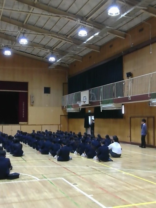 集会では学年主任の山口先生から、失敗を恐れチャレンジすることの大切さなどについて