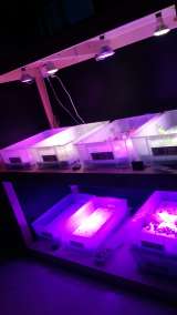 LEDの種類、色、光源までの距離など 条件を変えて研究を行っています。 植物の生...
