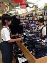 商品にシールを貼ったり、商品やかごを整理しています。