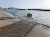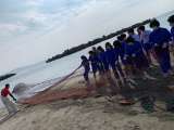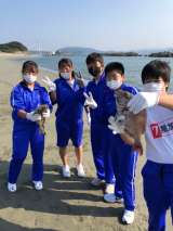 選択体験、漁業体験のようすです。ホテルの浜を利用して、地引き網の体験を行います。
