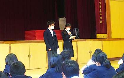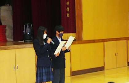 生徒会長からは今年度生徒会活動の中で達成されたことや、たくさんの意見が未来製造機に届けられたことなどが伝えられました。