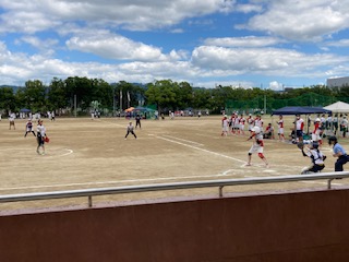 本日も久宝寺球場でソフトボールの試合が行われました。1試合目の相手は新喜多・樟蔭合同チームに12対6で勝ちました。2試合目の相手は交野第4中学校で、惜しくも2対3で負けてしまいました。