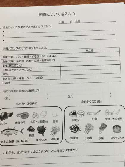 今日の家庭科の授業では、朝食の大切さと、栄養バランスのとれた食事を毎日必ず取ることを学びました。生徒達は今後自分の朝食ではどのようなことに気をつけるか、ワークシートに記入し発表して行きました。