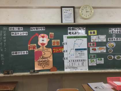 1年生の家庭科の授業で、食事について学んでいます。食事と生活習慣、中学生に必要な栄養素、食品と栄養素について学習をしてきました。そして今日の6時間目に1年5組で「朝食について考えよう」の研究授業がありました。