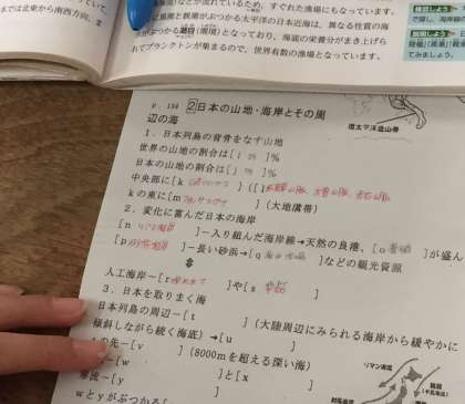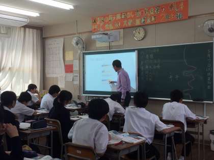 2年生の社会の授業では、干拓と埋め立ての説明に生徒たちが真剣に聞き入っていました。干拓の「干」と「千」の書き方を聞き、生徒たちは漢字に気をつけながら書いていました。