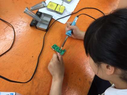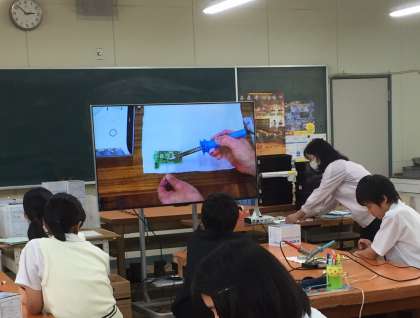 先日2年4組の技術の授業でお伝えしたダイナモラジオの様子です。電子黒板を用い、手元の作業の様子を生徒に見せることで、細かい作業の様子を理解し、安全に気を付け集中してはんだ付けをしていました。