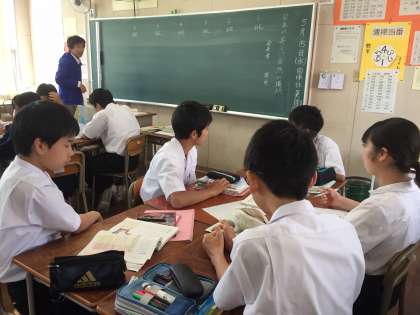 主体的対話的な学習として、2年生の国語の授業でも班別学習を取り入れています。今日の2年3組の授業では各班で話し合い、意見を出し合っていました。