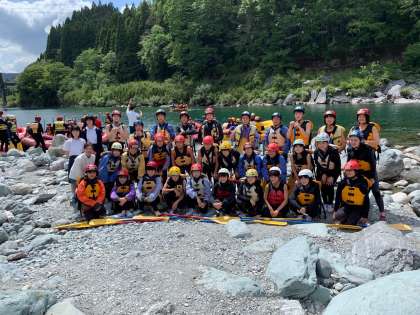 みんな着替え終わり、準備が整いました。記念写真を撮り、今からラフティングの体験です。