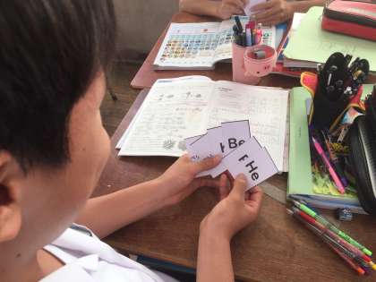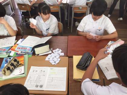 理科の授業では、化学の元素記号を学習していました。『スイヘイ リーベ クラークカ』、一生懸命覚えた元素記号をもっと効果的に学習する方法として元素記号を用いたカードで学習している様子です。