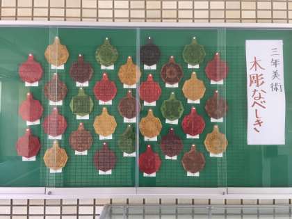 本校の玄関には現在3年生の木彫なべしきが展示されています。細かなところまで丁寧に彫られた作品は圧巻です。ぜひともご来校の際にはご覧ください。