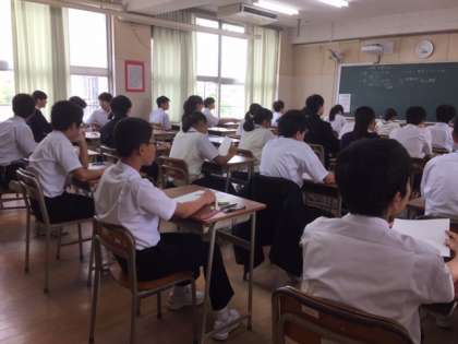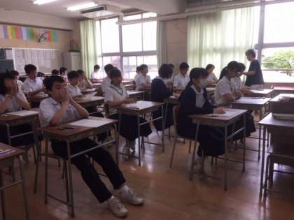 中間テスト2日目、数学のテストが始まる直前の3年1,2組の様子です。落ち着いて問題に取り組んでくださいね!