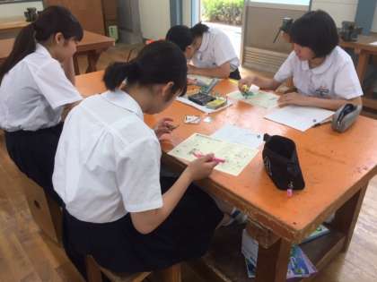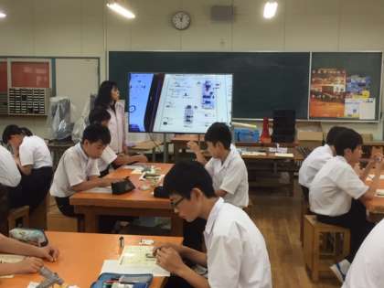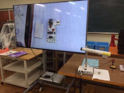 トランジスタラジオ製作の授業ですが、書画カメラと電子黒板を使い、作業の様子だけでなく、部品の仕組みの説明も行います。コンデンサやダイオードの働きを学習し、それらの取り付けを行います。