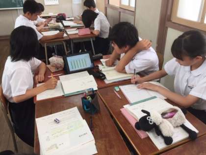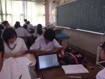 2年2組の国語の授業でタブレットを使った授業が行われていました。『若手もベテランもICT』を合言葉に、本校の国語科のベテラン教員もタブレットを使っています。短歌十首から何を読み取ったか生徒たちはグループで話し合っていました。