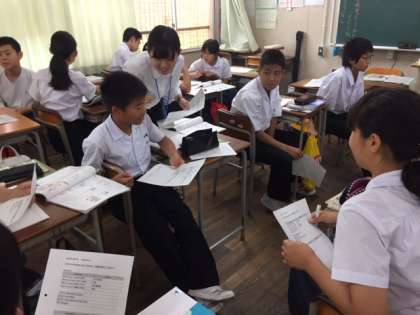 写真は1年3組の授業の様子です。生徒たちはペアワークが終わった後、さらに周りの友だちと英語で話す練習をしていました。
