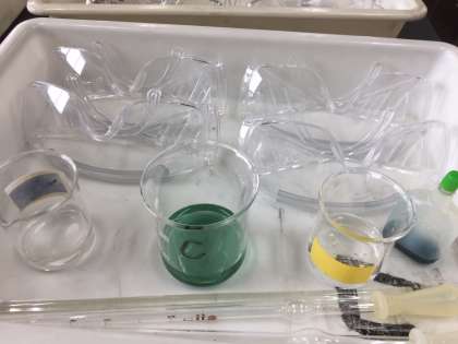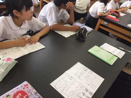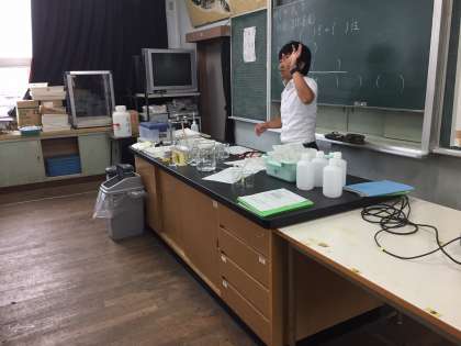 理科の授業では、中和の内容でした。実験後なぜ酸性がアルカリ性の物質を混ぜると打ち消されるのか、各グループで話し合いが行われていました。塩酸、水酸化ナトリウム水溶液を使うため、保護メガネ等で安全に配慮し実験が行われていました。