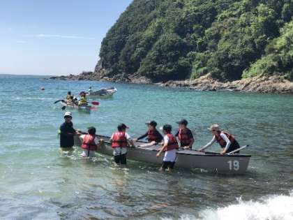 カヌーがスタートしました。天気は快晴ですが、風が強く、沖まで出るのが大変です。