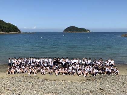 6月13日(木) 1年生 一泊移住 全体写真(宿泊施設前の浜辺にて)