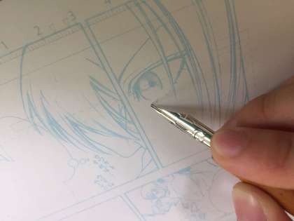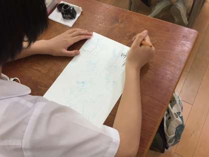 マンガ・アニメ講座ではマンガのウラ話や描き方のエッセンスを教えていただきました。プロも基本同じペンを使っているというお話を聞き、実際に線入れをしてみました。なかなか思い通りに線が描けず、指先の力加減をいろいろ試しながら描いていました。