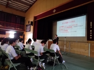7月4日(木)の午後に私立高校4校の先生にご来校いただき、3年生生徒・2,3年生保護者向けに説明会をしていただきました。ここでは細かいところまでお伝え出来ませんが、興國高等学校では勉強でもスポーツでも自分のやりたいことが必ずできることを、好文学園女子高等学校では学びたいことが必ず見つかるコースの紹介を、大阪高等学校では生徒主体の取り組みで様々な分野でメディアにとりあげられていることを、桃山学院高等学校では文武両道で卒業生と連携していることや各コースの説明がありました。