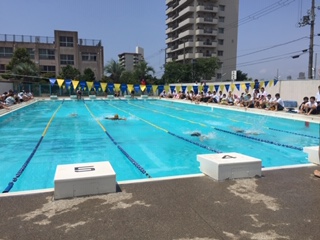朝方の通り雨がありましたが、天候に恵まれ、3,4時間目に2年生は水泳大会がありました。台風の影響により昨年は水泳大会ができず、生徒たちは今日をとても楽しみにしていました。各クラスの応援はすばらしく、みんなその応援にこたえようと頑張って泳いでいました。