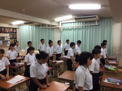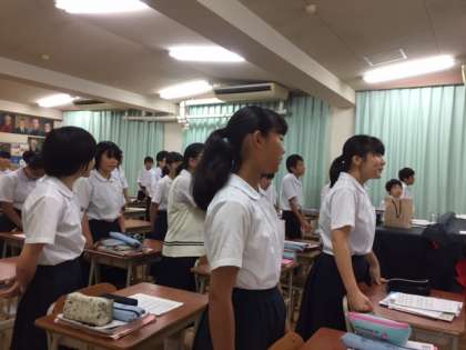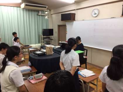 音楽の授業の始まりは大阪市歌、校歌から始まります。2年4組は大きな声で歌う男子生徒と綺麗な旋律を奏でる女子生徒の歌声が調和します。2年生の各クラスは持ち味があり、2学期に行われる合唱コンクールが楽しみです。
