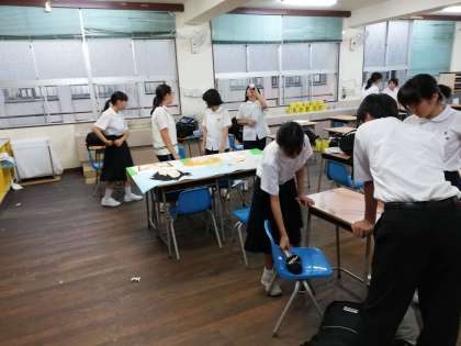 美術イラスト部の2年生が階段アートを作成しています。完成が楽しみです。