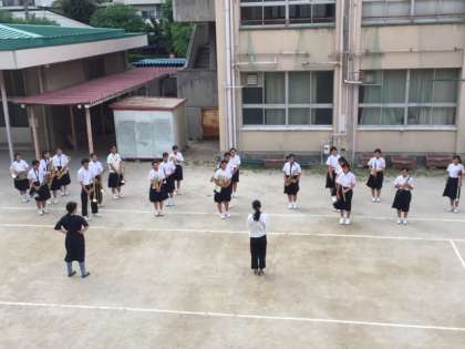 吹奏楽部が中庭でマーチングの練習をしている様子です。