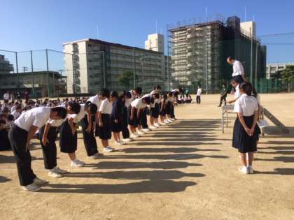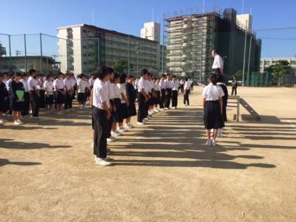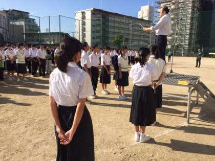 今日の全校集会では生徒会認証式と水泳部、大阪市中学校総合文化祭に作品が掲示された生徒への表彰伝達がありました。