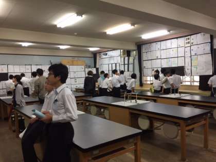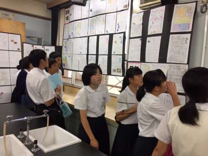 理科室の様子です。2年4組の生徒たちは友だちの動物新聞のできに見入っていました。
