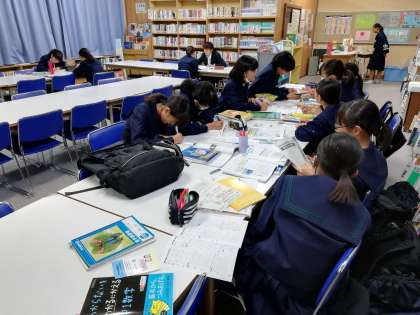 放課後、大阪市立大学の学生が学習ボランティアで来ています。生徒たちはその日の積み残しを質問に図書室に集まり、勉強していました。