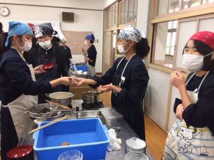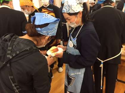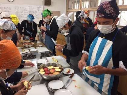 2年4組の調理実習の様子です。りんごの切り方をチェックしてもらっています。
