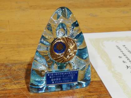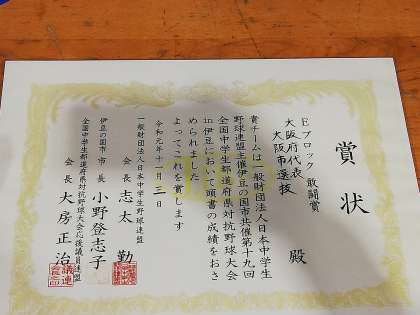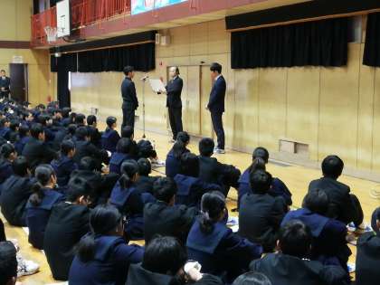 終業式後、2つ表彰伝達がありました。1つは学校全体で取り組んだ募金活動について生徒会役員の生徒たちが代表で表彰され、もう1つは大阪府代表大阪市選抜に選ばれた本校の3年生の生徒の敢闘賞の表彰がありました。