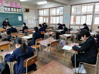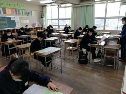 今日の9時より3年生は予定通り公立一般入試の出願に向かいました。また10時より1年生は1・2年教室を使い、濃厚接触を避け分散集合し、学年末テスト並びにチャレンジテストの返却、健康観察を行いました。明日の10時より、2年生も同様に行う予定です。