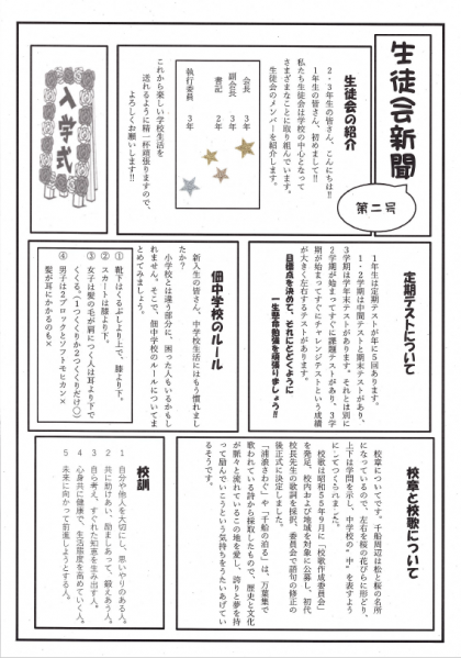 4月当初に発行予定だった生徒会新聞です。3月に作成が、みなさんにお渡しできる機会がなかったのでホームページに上げさせてもらいます。