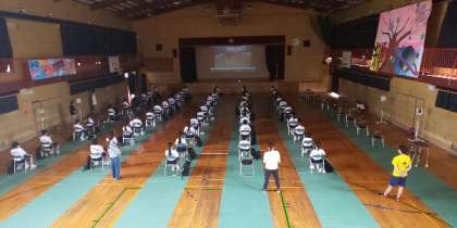 写真は月曜日の登校日の様子です。部活動紹介の動画を見た後、身長・体重・視力の測定を行いました。