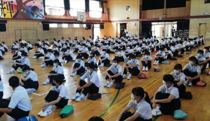毎週水曜日は3年生の学年集会があります。生徒間の距離をあけ、あいさつも最低限にしております。3年生の生徒たちは静かに集まり落ち着いた状態で集会を行いました。