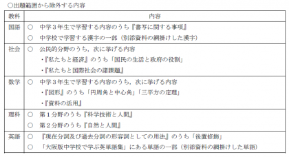 6月19日、新型コロナウイルス感染拡大防止に伴う臨時休業の期間が長期にわたったことから、最終学年における学習の定着等に配慮する必要があることを踏まえ、学習内容の一部を出題内容から除かれることが大阪府教育委員会より発表されました。詳しくは以下のURLをご参照ください。