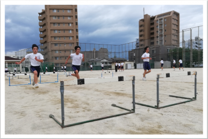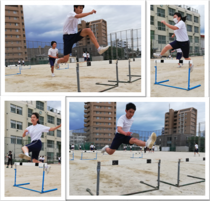 3年生の体育では、ハードル走をしています。写真は3年1,2組の体育の様子です。