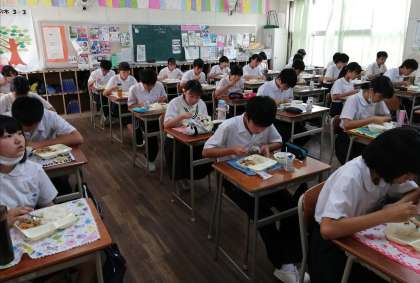 今日の給食は豚丼、すまし汁、いり黒豆です。