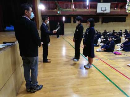 今日の3年生学年集会では、夏に生徒たちが書いた税の作文の優秀者に校長先生から表彰伝達がありました。