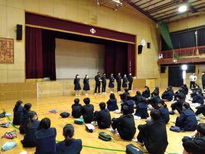 「僕たち私たち40期生は3年間を振り返るとたくさんの行事を成功させてきました。一人ひとりが自覚を持ち、目標を高くかかげ、学年全員で様々な壁を乗り越えてきました。最後の卒業式を、今までの行事の中で一番の思い出にするために全員で頑張りましょう。」