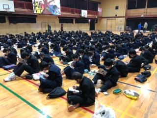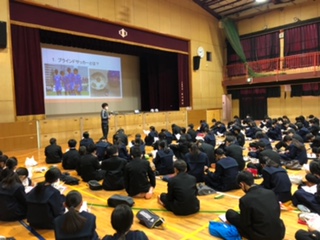 本日の1時間目、体育館にて、障がい理解教育を行いました。内容はブラインドサッカーについてです。