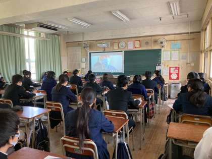 緊急事態宣言が解除されましたが、今日の集会はオンラインで校長室と3年生の各教室を繋ぎ行いました。ネット環境の脆弱さもありスムーズな画像ではありませんでしたが、生徒たちは校長先生のお話を静かに聞きました。