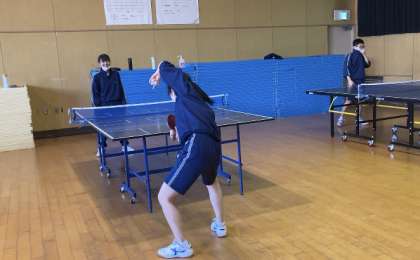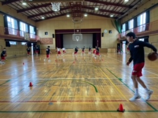 写真は男子バスケットボール部の練習と卓球部の新しいサーブ開発の様子です。