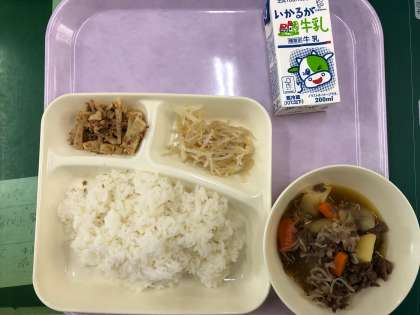 今日の献立はご飯、肉じゃが、もやしのゆずの香和え、ごまかかいため、牛乳です。