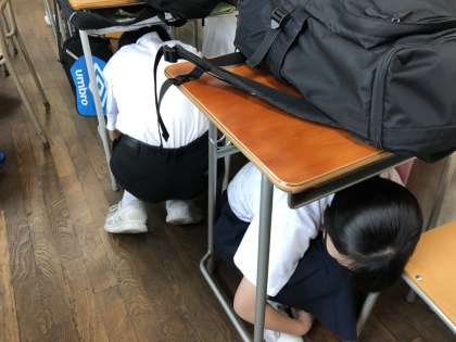本日、地震を想定した避難訓練を行いました。机の中に避難したり、また自分の割り当てられた地域に私語することなく移動、解散しました。