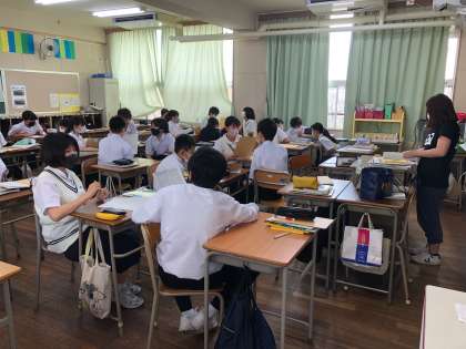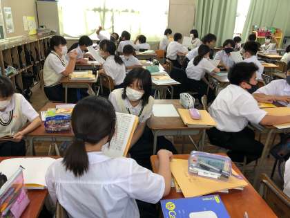 写真は1年3組の英語の授業でペアワークをしている様子です。
